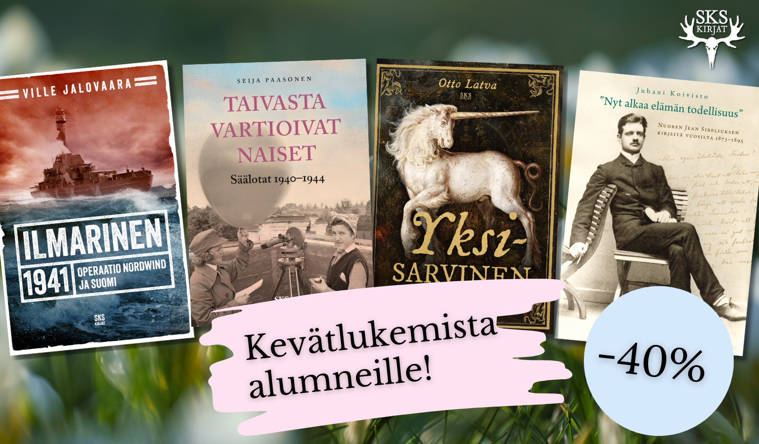 Tarjoamme Helsingin yliopiston alumniyhdistyksen jäsenille 40 % alennuksen tälle sivulle kootuista SKS:n uutuuskirjoista 30.4.2026. asti. Saat alennuksen käyttämällä verkkokaupan ostoskorin Kampanjakoodi-kentässä Alumniyhdistykseltä saamasi koodin.